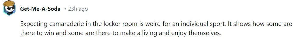 对于一项个人运动来说,期待更衣室里有友情是一件很奇怪的事情。这表明有些人是为了赢球而来,而有些人是为了谋生和享受。