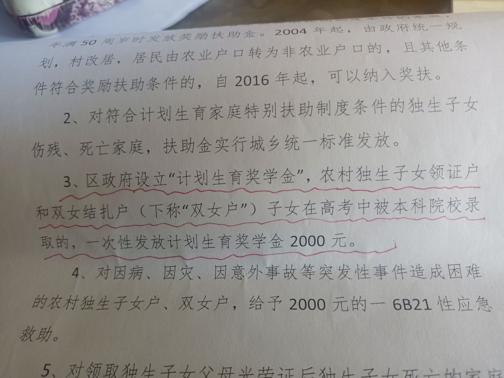 本人是同乐街道花园社区的居民。因了解到政策有对独生子女领证户和双女户的子女在高考中被本科院校录取的,政府一次性发放计划生育奖学金2000元的政策。