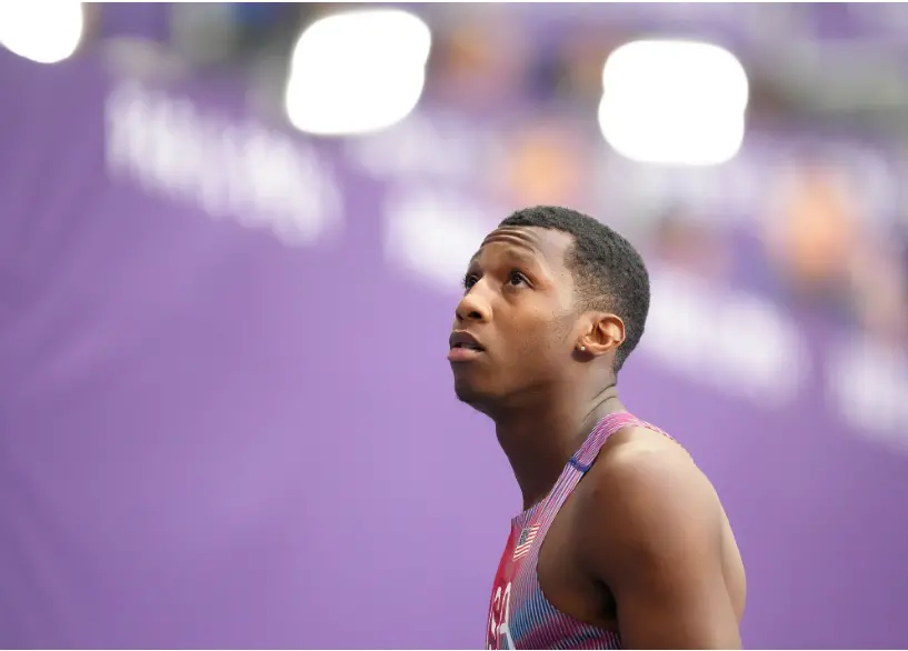 8月7日,美国选手奈顿在比赛后。当日,巴黎奥运会田径男子200米半决赛在法兰西体育场举行。新华社记者 吕小炜 摄