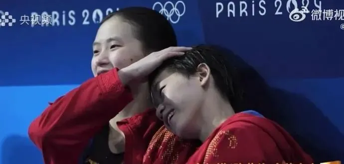 那是她和陈芋汐一起夺的金牌,是她整个奥运期间最明媚最张扬最开心的一次炫耀。