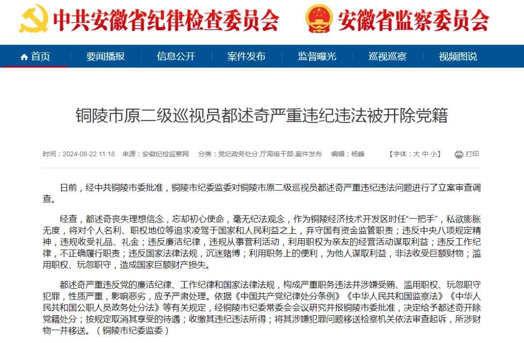都述奇严重违反党的廉洁纪律、工作纪律和国家法律法规,构成严重职务违法并涉嫌受贿、滥用职权、玩忽职守犯罪,性质严重,影响恶劣,应予严肃处理。依据《中国共产党纪律处分条例》《中华人民共和国监察法》《中华人民共和国公职人员政务处分法》等有关规定,经铜陵市纪委常委会会议研究并报铜陵市委批准,决定给予都述奇开除党籍处分;按规定取消其享受的待遇;收缴其违纪违法所得;将其涉嫌犯罪问题移送检察机关依法审查起诉,所涉财物一并移送。(铜陵市纪委监委)