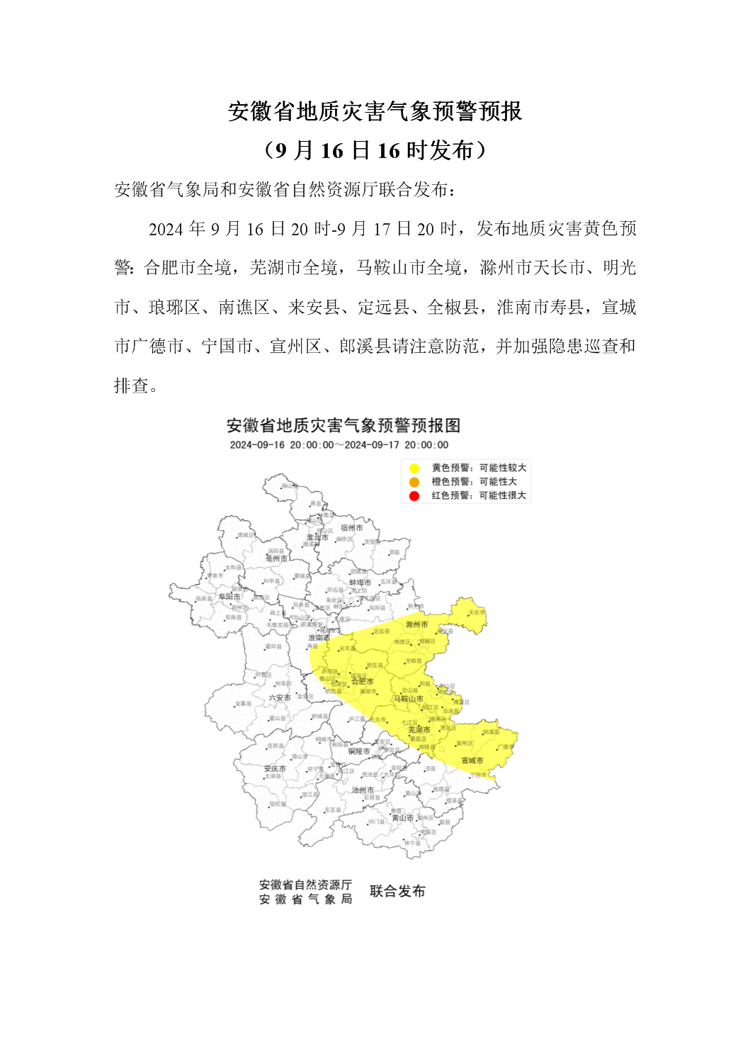 2024年9月16日20时-9月17日20时,发布地质灾害 黄色预警 :合肥市全境,芜湖市全境,马鞍山市全境,滁州市天长市、明光市、琅琊区、南谯区、来安县、定远县、全椒县,淮南市寿县,宣城市广德市、宁国市、宣州区、郎溪县请注意防范,并加强隐患巡查和排查 。