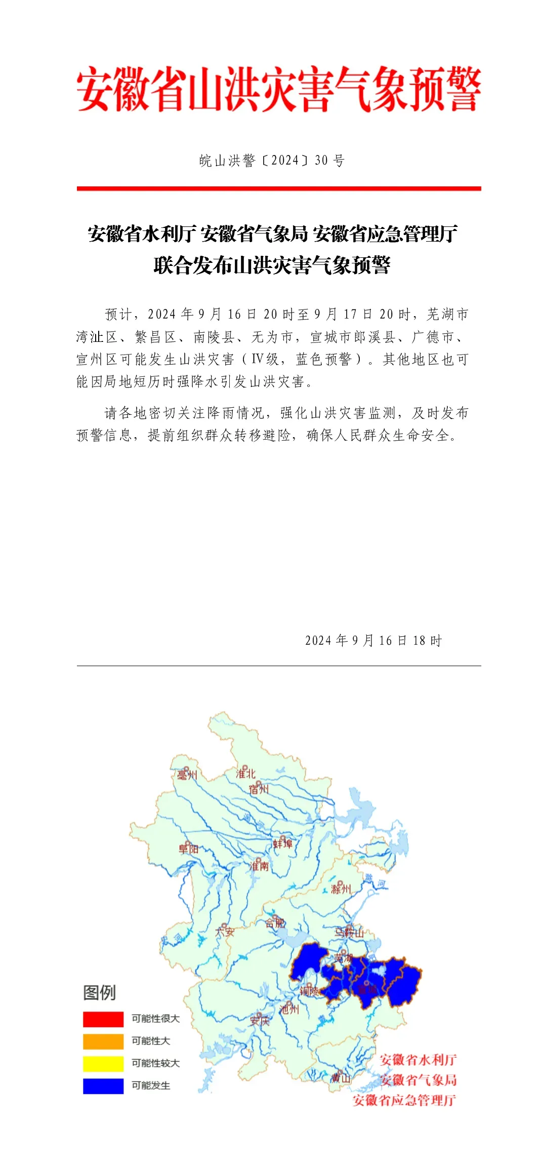 预计,2024年9月16日20时至9月17日20时,芜湖市湾沚区、繁昌区、南陵县、无为市,宣城市郎溪县、广德市、宣州区可能发生山洪灾害(Ⅳ级,蓝色预警)。其他地区也可能因局地短历时强降水引发山洪灾害。请各地密切关注降雨情况,强化山洪灾害监测,及时发布预警信息,提前组织群众转移避险,确保人民群众生命安全。