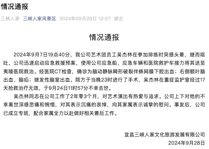 2024年9月7日19点40分,我公司艺术团员工吴杰林在参加排练时突感头晕,继而呕吐,公司迅速启动应急救援预案,使用公司应急船、应急车辆和医院救护车接力将其送至夷陵医院救治。经医院CT检查,确诊为脑动静脉畸形破裂伴蛛网膜下腔出血;右侧额叶脑出血、脑疝;继发性脑室出血。院方于当晚23时进行了手术,吴杰林在重症监护室经过17天抢救治疗无效,于9月24日11时57分不幸去世。