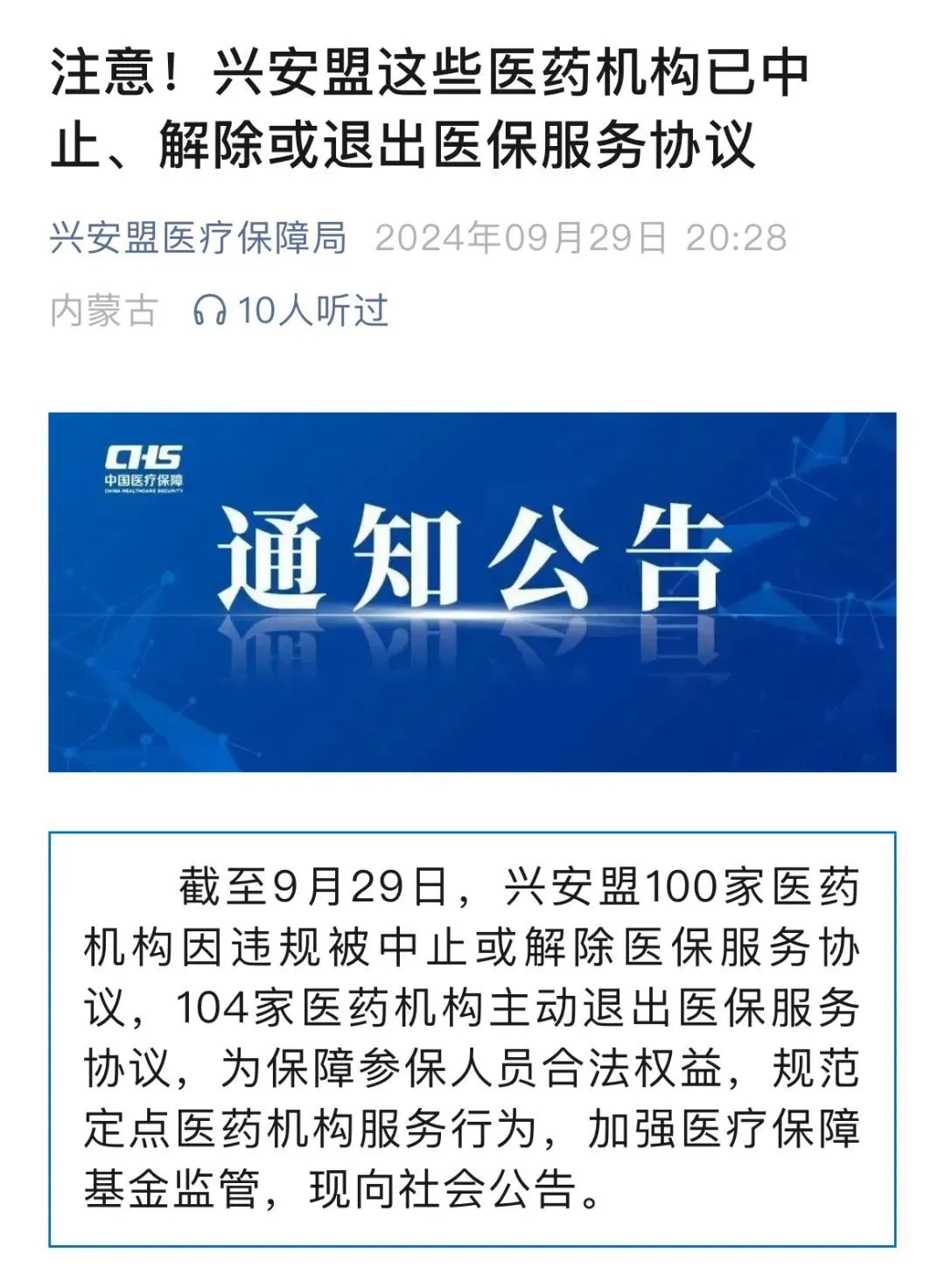 9 月 29 日,兴安盟医疗保障局发布公告,截至当日,兴安盟 100 家医药机构因违规被中止或解除医保服务协议,104 家医药机构主动退出医保服务协议。