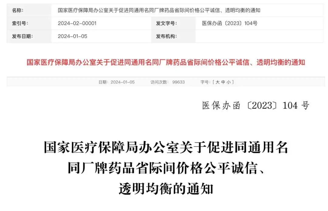 今年 1 月,国家医保局发布的《关于促进同通用名同厂牌药品省际间价格公平诚信、透明均衡的通知》,提出医药采购机构到 2024 年 3 月底前基本消除「四同药品」(指通用名、厂牌、剂型、规格均相同的药品)省际间的不公平高价、歧视性高价。