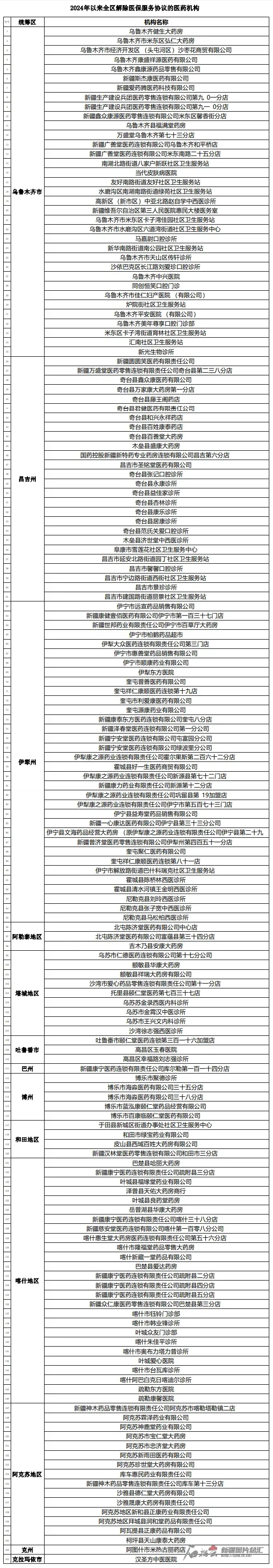 新疆自治区 2024 年以来解除医保服务协议的医药机构名单 图源:新疆医疗保障局