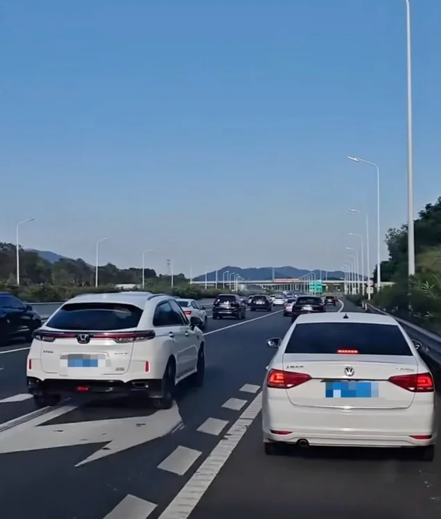 白色小车在应急车道上行驶占道。图/社交媒体截图