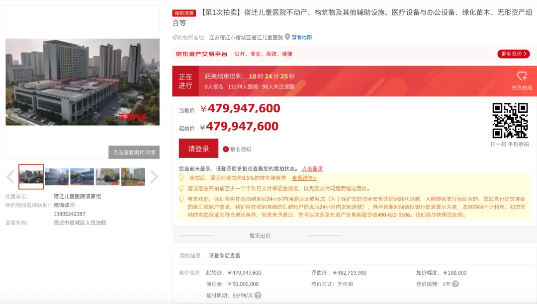 而对宿迁儿童医院来说,竞买公告显示,该医院的评估价约为4.8亿元,起拍价在4.79亿元左右,需交纳保证金5000万元,增价幅度按“10万元及其整数倍”计算。