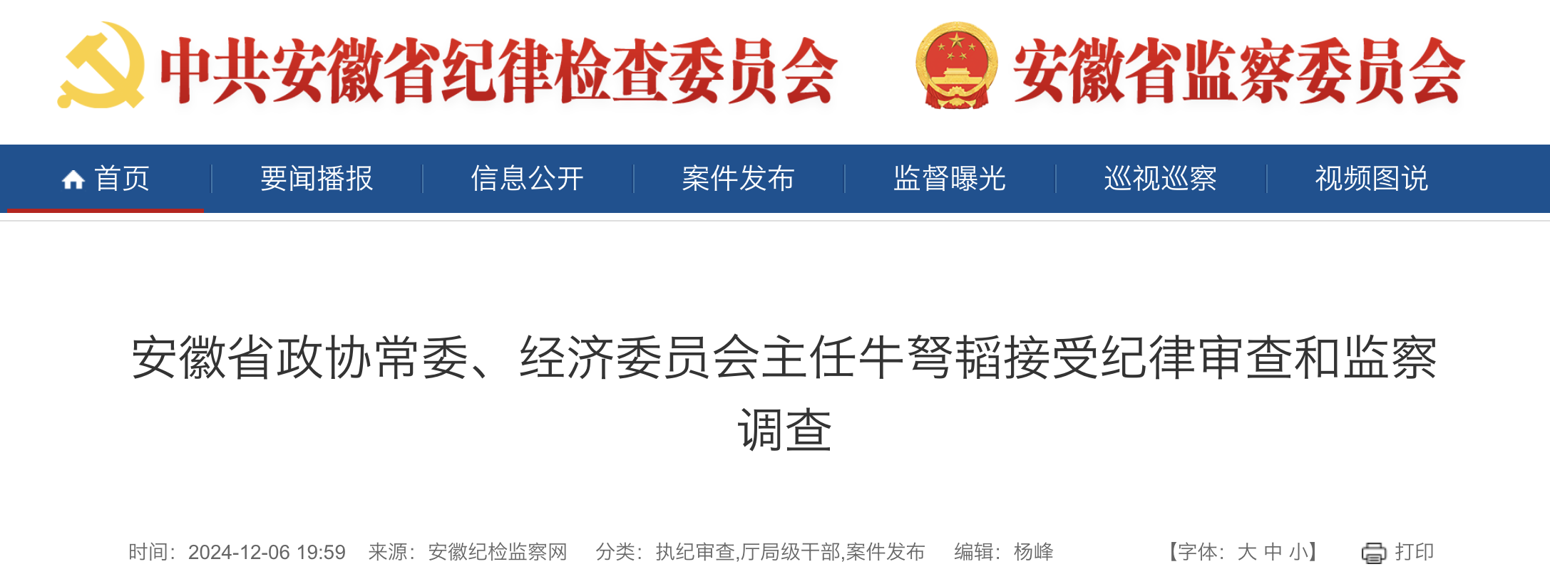 安徽省政协常委、经济委员会主任牛弩韬涉嫌严重违纪违法,目前正接受安徽省纪委监委纪律审查和监察调查。(安徽省纪委监委)