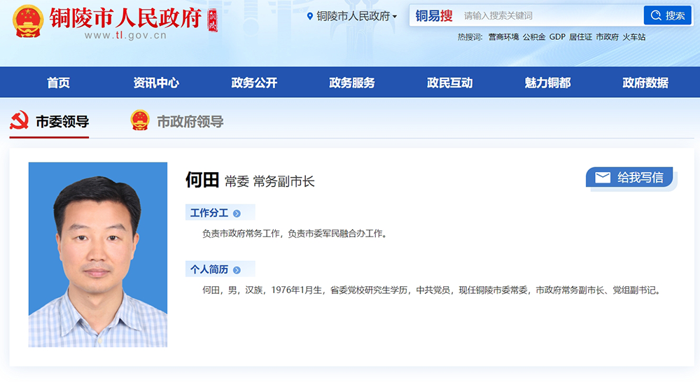 铜陵市政府官网显示,何田负责市政府常务工作。负责发展改革、财政、安全生产和应急管理、国有资产监管、统计、金融及投融资监管、“双招双引”、公共资源交易监管、开发园区建设管理方面工作。分管市发展改革委(粮食和储备局)、财政局、应急局、国资委、统计局、招商服务中心、行政学院、国控集团、公共资源交易监管局、公共资源交易中心,铜陵经济技术开发区、蚌埠铜陵现代产业园区管委会。