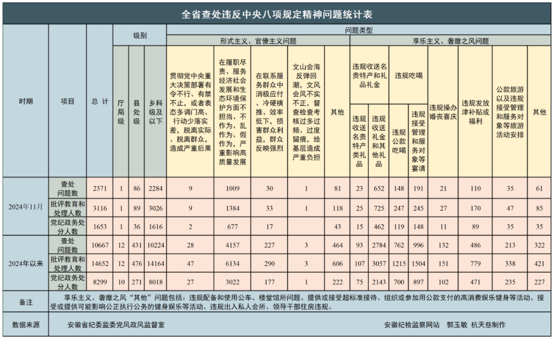 2024年11月,全省纪检监察机关共查处违反中央八项规定精神问题2371起,批评教育和处理3116人,其中给予党纪政务处分1653人。