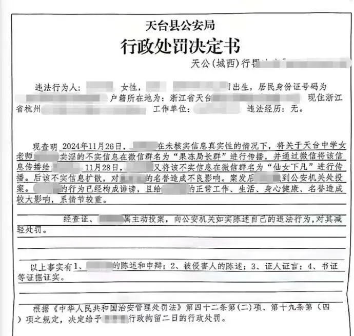 2024年11月,一则关于浙江台州天台县某中学女教师“卖淫被抓”的传言在微信群中流传,后该信息被天台县公安局确认不实,三名涉及传播该信息的女教师构成诽谤,被处以行政拘留。