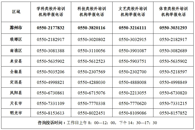 孩子们的健康成长需要家校社共同努力。国庆中秋假期期间如果您发现违规开展学科类培训、在职中小学教师违规有偿补课、培训机构虚假广告宣传等违法违规行为,请及时拨打下方电话向我市相关主管部门进行举报。预祝全市家长朋友和学生们假期愉快!