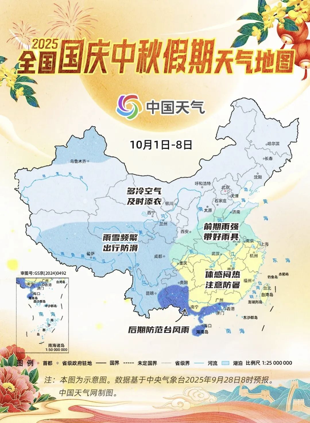 具体预报如下 ↓↓↓ 10月1日 多云,19~26℃ 10月2日 多云转阴有阵雨或雷雨 阵风8级左右 22~29℃ 10月3日 小到中等阵雨或雷雨 21~24℃ 10月4-5日 多云,21~30℃ 10月5日夜里-6日 阴有阵雨转阴到多云,阵风7级 20~24℃ 10月7-8日 多云,17~22℃ 国庆中秋假期降水较多 大雾天气频繁 大家出行请注意交通安全 同时气温起伏较大 大家还要合理着装,谨防感冒 来源:综合中国天气网、安徽气象、滁州市气象局 |