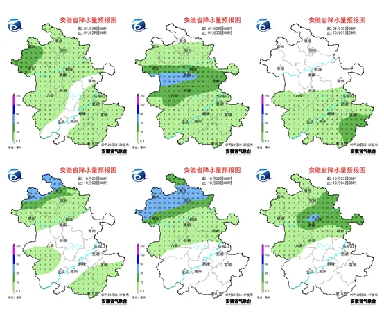 气温方面 10月1-4日 淮河以北最高气温23~26℃ 淮河以南最高气温27℃以上 10月2-5日 江南南部有35℃以上的高温天气 10月5日夜里-7日 受较强冷空气影响 安徽自北向南将有一次 大风和降温过程 全省平均气温将下降4~6℃ 同时偏北风力增至4级 阵风7~8级