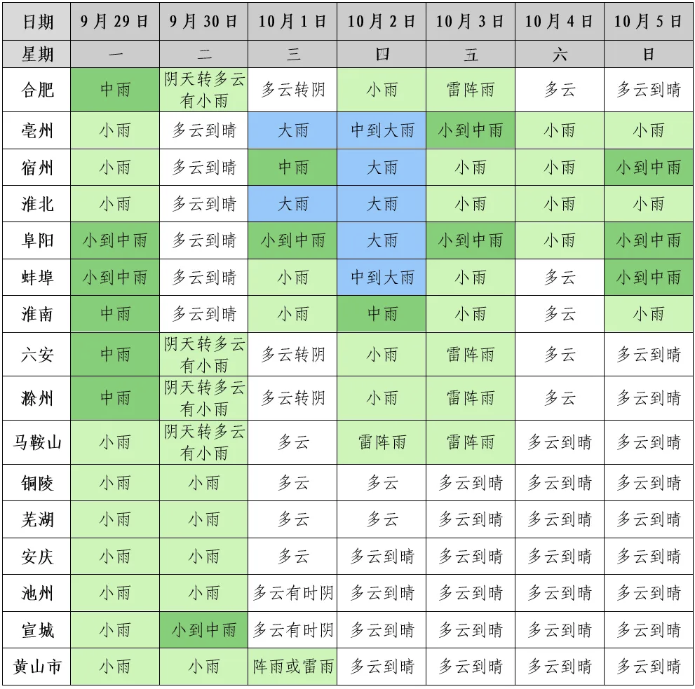 据安徽气象消息 10月1-5日沿淮淮北 有较明显降水过程 其中10月1-2日 部分地区有大雨,局部暴雨 并伴有短时强降水和雷暴大风等 强对流天气 10月3-4日 局部有大雨 10月6-8日 逐渐转为多云到晴天气 10月1-8日 淮河以南以多云到晴天气为主
