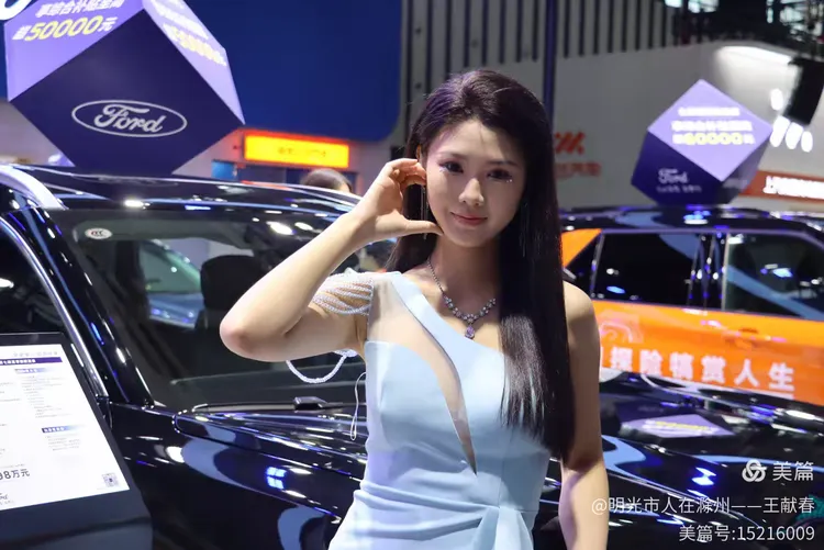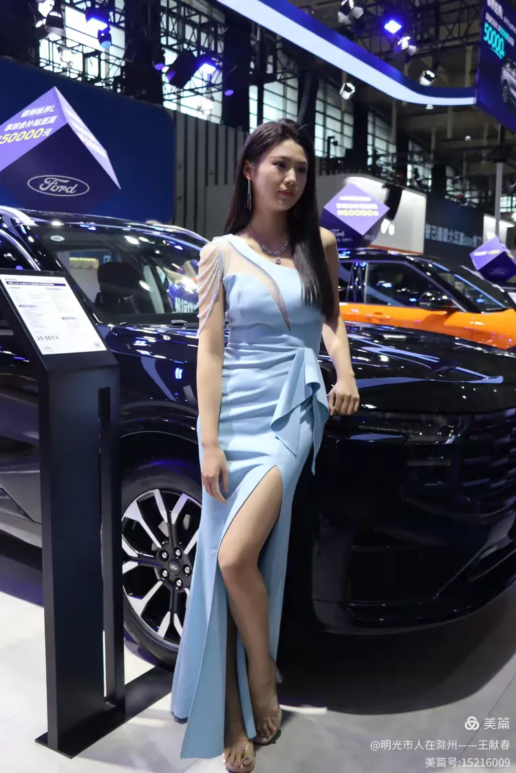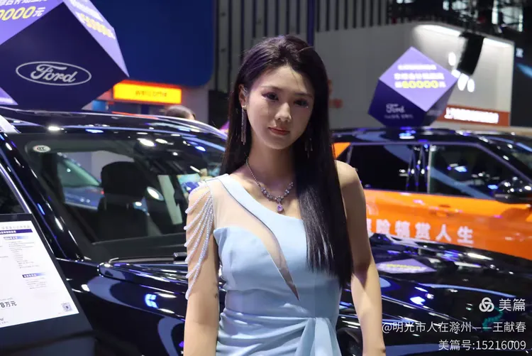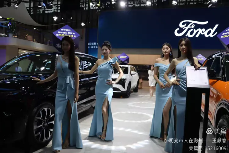 一位穿黑色露肩礼服的女子站在福特展台前,姿态从容,像是在向人群介绍什么。灯光打在她身上,也照亮了那辆黑色福特的轮廓。展台布置精致,海报上的标语写着“福袋回家”,像是把期待打包送进现实。