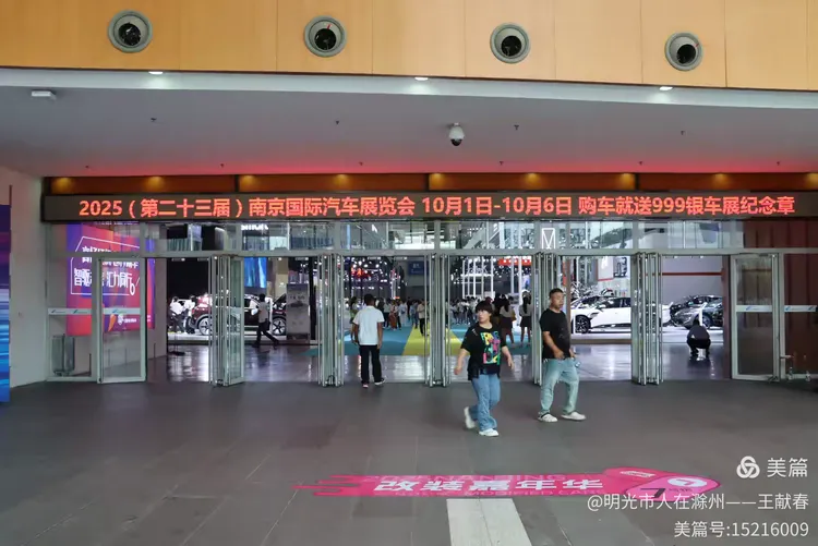 入口处的彩色拱门像一道通往未来的彩虹,上面写着“2025南京国际车展”,还有那句轻快的标语:“MORE FUN MORE POSSIBILITY”。卡通形象在两侧跳跃,黄格地面延伸向内,人群熙攘,笑声与快门声交织。我站在人潮中,忽然觉得,这不只是看车,更像是参与一场城市生活的庆典。