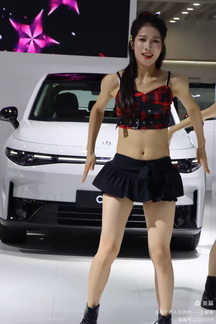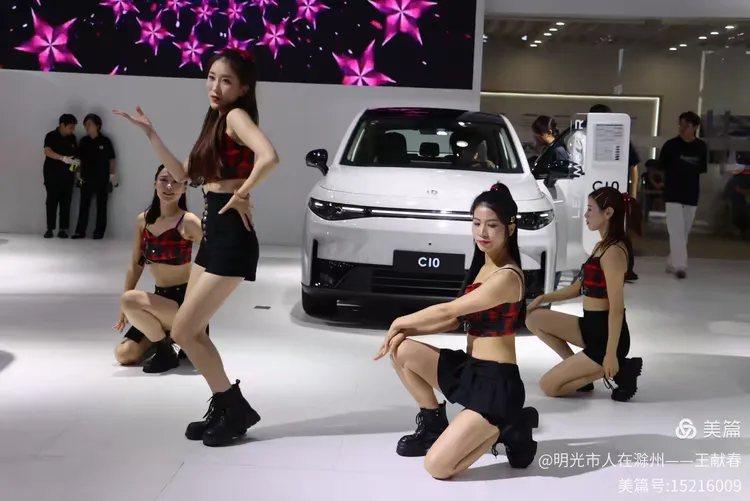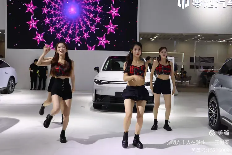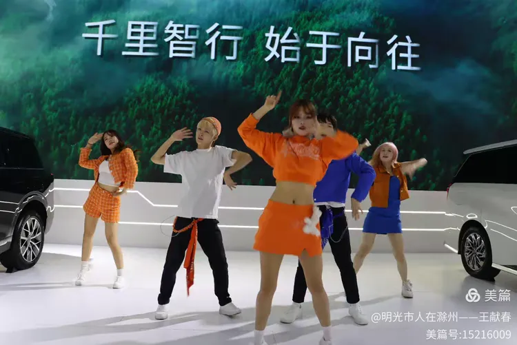 舞台中央,一群舞者正在表演,动作整齐有力,背景大屏写着“千里智行 始于向往”。两辆展车静静停在舞台两侧,像是这场演出的见证者。音乐激昂,灯光流转,我站在人群后,忽然觉得,这场车展不只是卖车,更是在讲述一种对未来的信念。