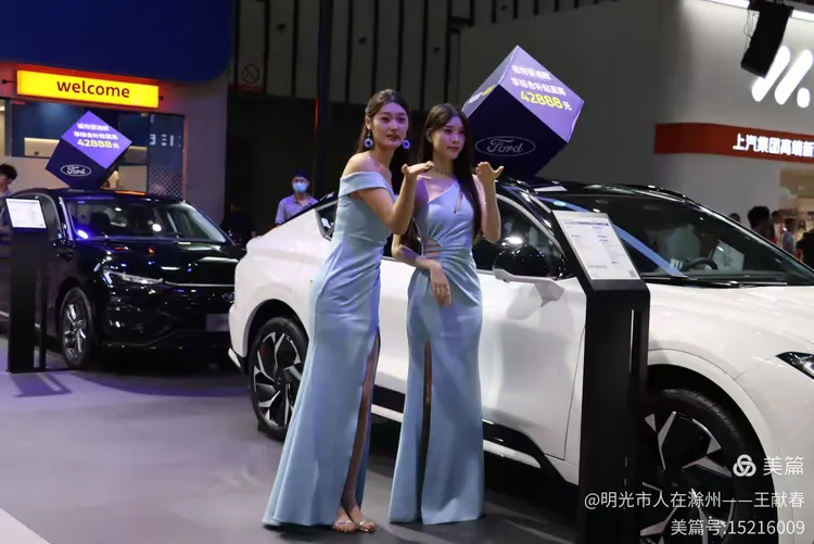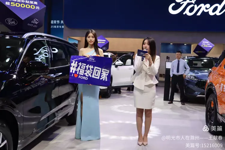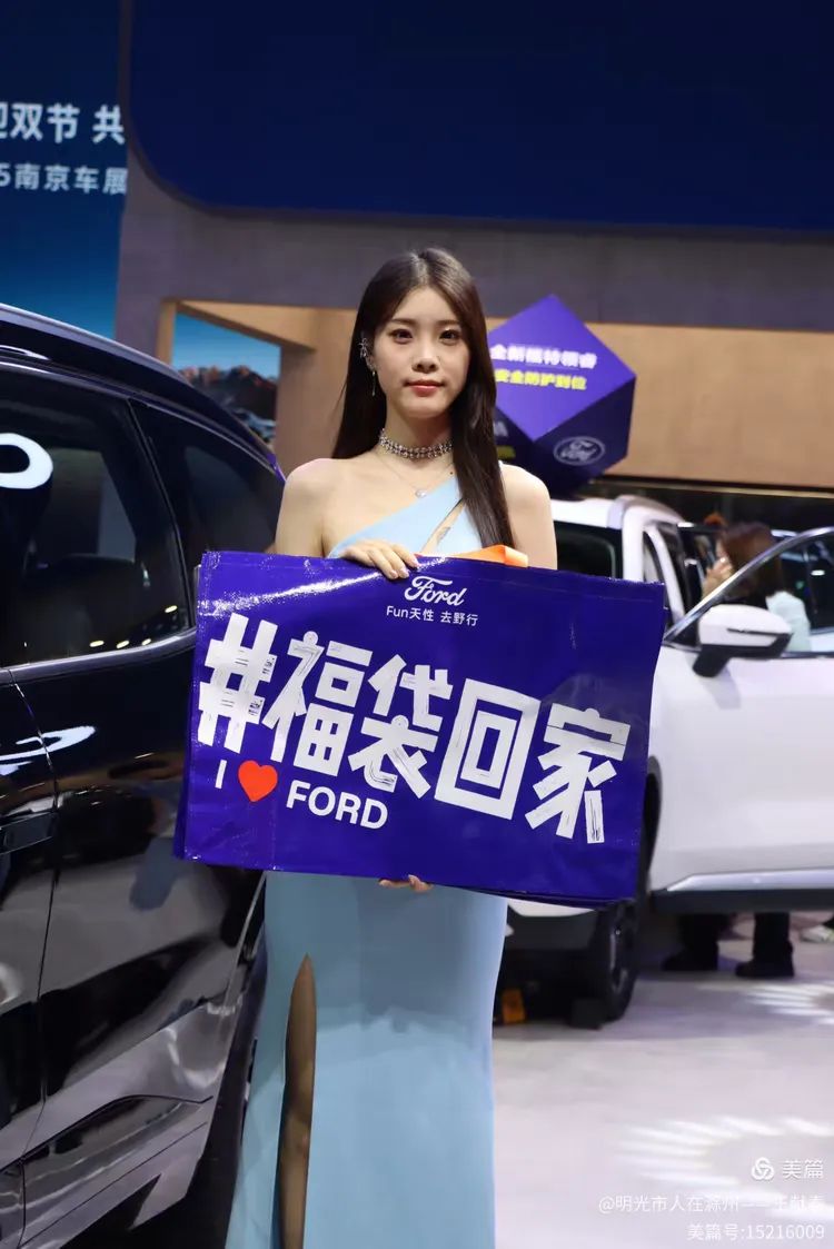 两位工作人员在福特展台前宣传,一人举着蓝色标牌,上面写着“#福袋回家 I ♥ FORD”,另一人分发手册。蓝色SUV与白色轿车并列而立,像一对默契的搭档。我接过一份资料,纸张微凉,却带着一种莫名的温度——那是品牌与人之间,最朴素的连接。