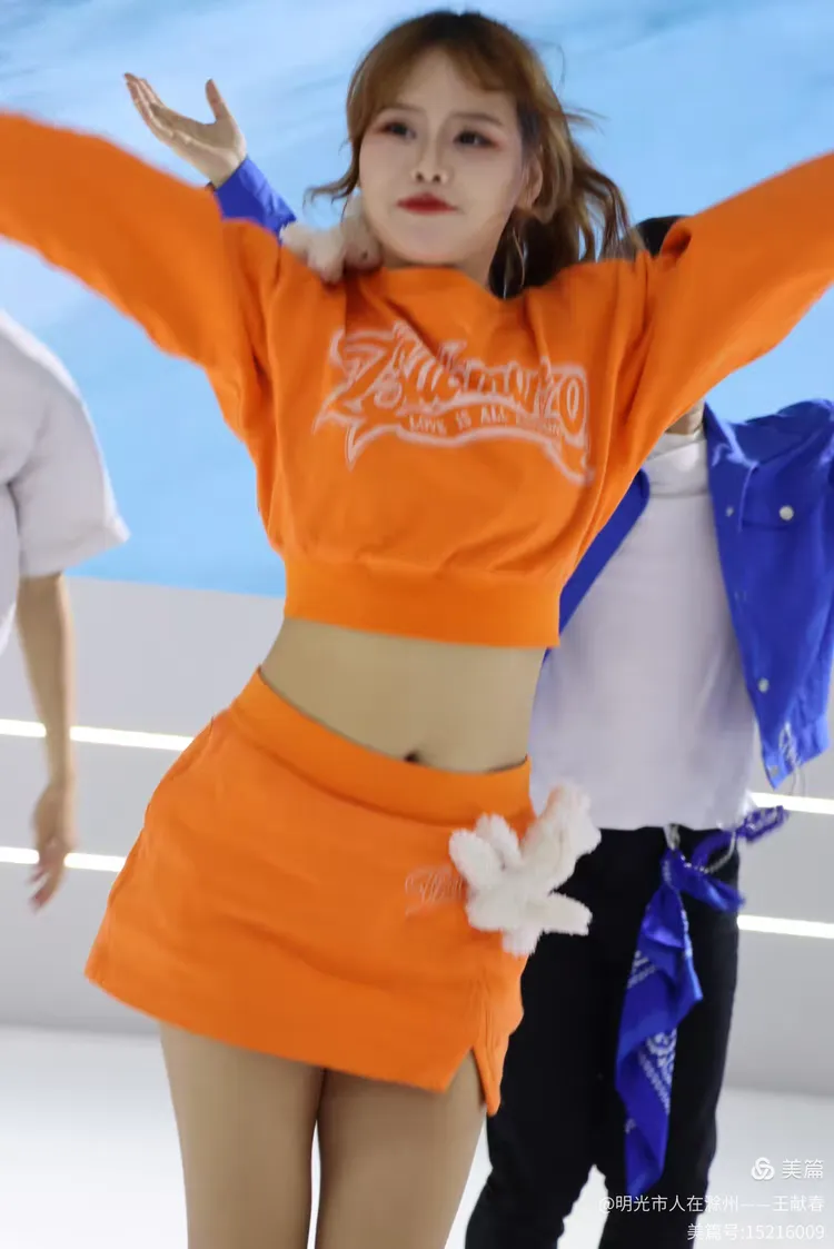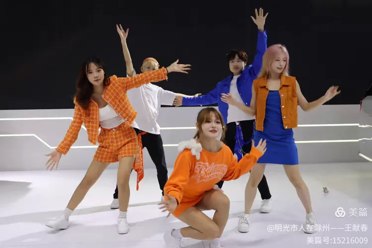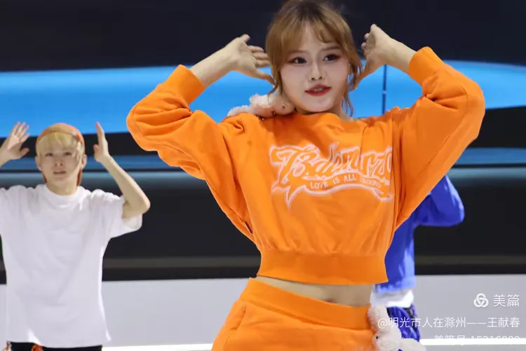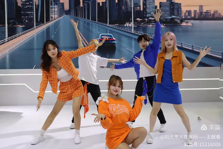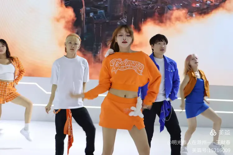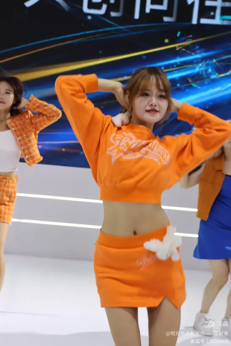 五位表演者在台上舞动,中间的女子穿着印有“Balmanzo”的橙色卫衣,活力四射。两侧同伴穿着蓝橙外套,节奏一致。他们的动作像在模拟驾驶、启程、飞跃——整场演出,仿佛是一段关于出发的寓言。