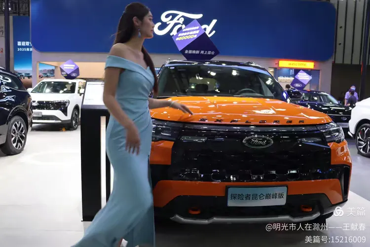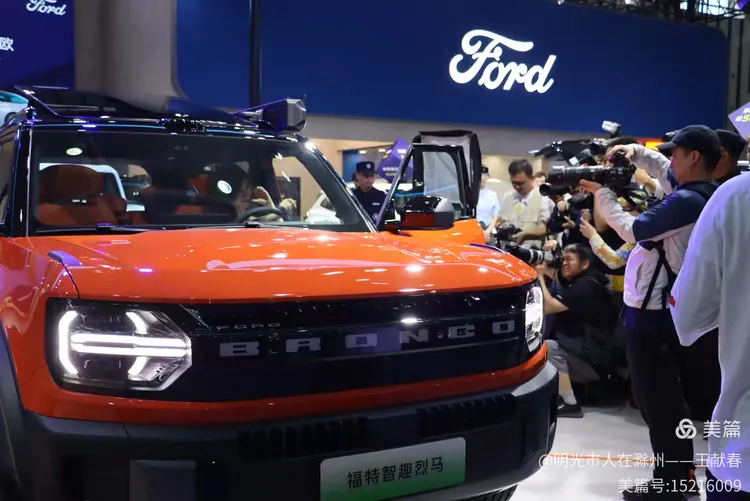一辆橙色福特车门敞开,车内有人,车灯亮着,摄影师们围在一旁,快门声此起彼伏。蓝色品牌标识在背后静静发光,像一种无声的宣告。我退后几步,看着这一幕——车已不仅是展品,它正在被记录、被传播,成为某种符号。