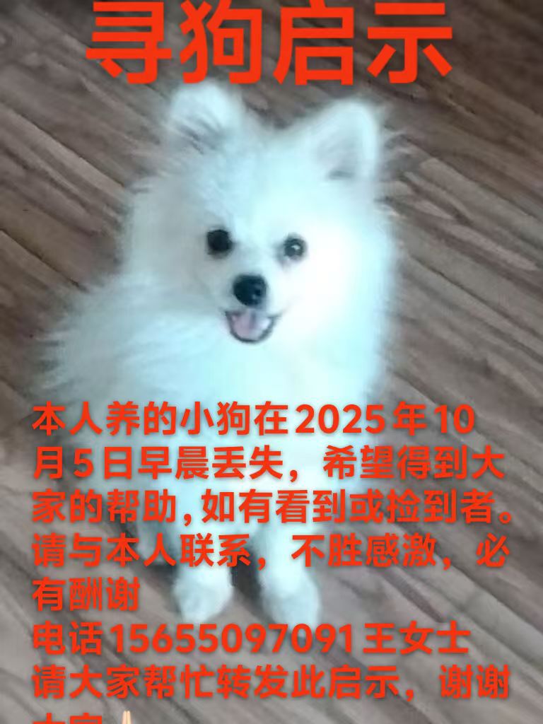 本人于10月5日在滁州学院汇丰校区附近丢失纯白色博美狗一条。 小狗名字叫汤圆公狗尾巴上有淡淡的紫色。小狗性格温顺,如有遇见或收留者请速与我联系,当面酬谢。