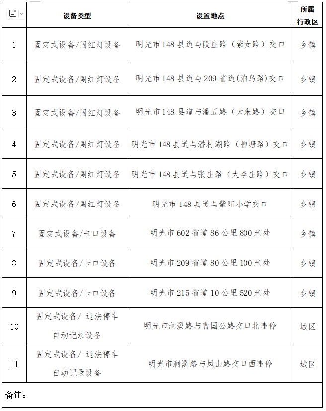 根据《中华人民共和国道路交通安全法》、《中华人民共和国道路交通安全法实施条例》以及安徽省实施办法,为进一步提高交通参与者的交通安全意识,预防和减少道路交通事故,明光市公安局交通管理大队新增6处闯红灯抓拍设备,3处卡口设备,2处违法停车自动记录设备,拟定于2025年10月27日开始投入使用。