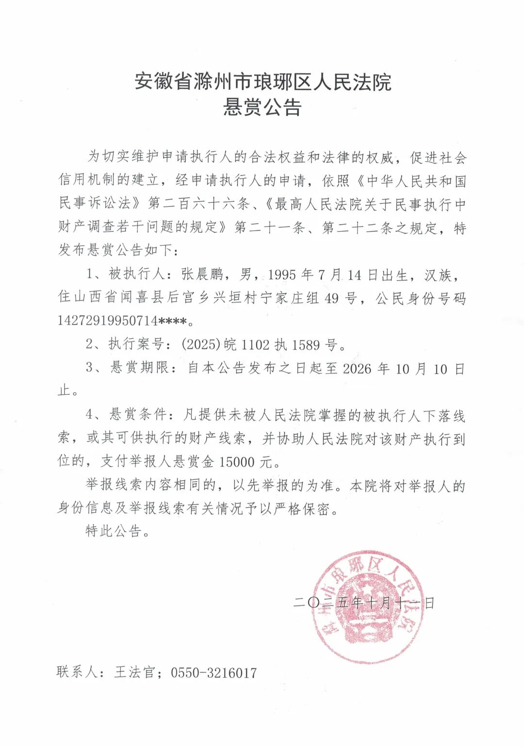 4、悬赏条件:凡提供未被人民法院掌握的被执行人下落线索,或其可供执行的财产线索,并协助人民法院对该财产执行到位的,支付举报人悬赏金15000元。