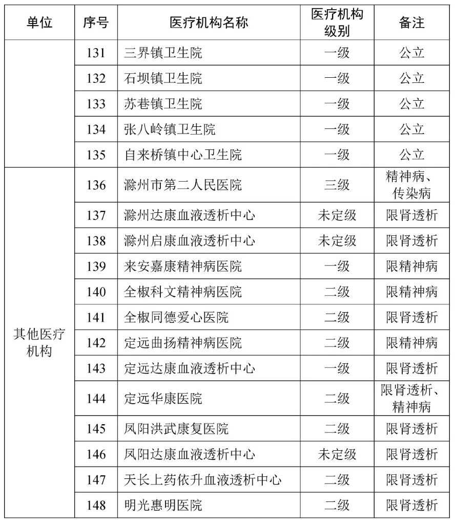 (三)专科定点医疗机构。按照文件要求,根据精神病、传染病等专科需求,全市将包括滁州市第二人民医院(兼具精神病、传染病诊疗资质)在内的精神病、传染科专科医院和符合条件的专业肾透析机构作为专科医疗救助定点医疗机构,满足困难群众特殊诊疗需求。