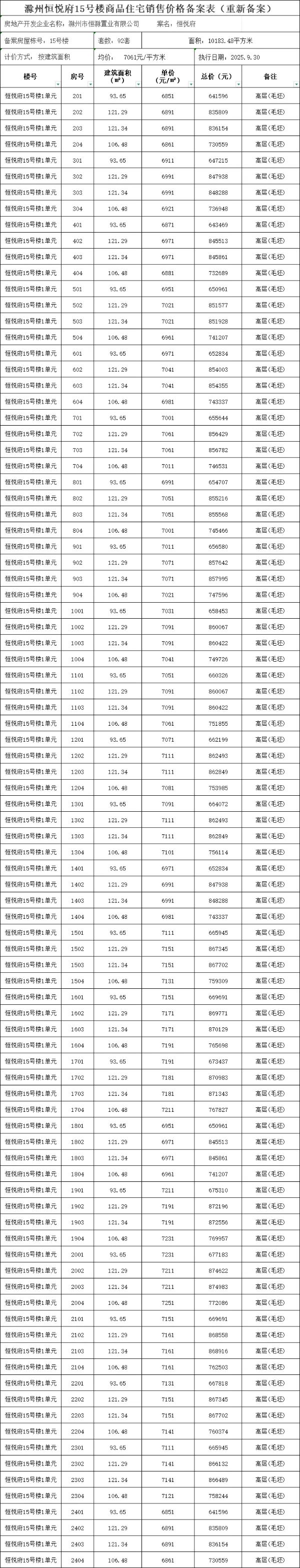 滁州恒悦府15#楼(重新备案)备案均价为7061元/㎡,共92套房源,户型面积为93.65㎡-121.34㎡。