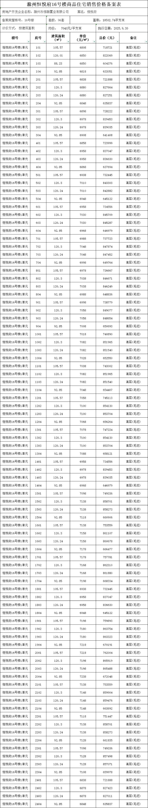 滁州恒悦府16#楼备案均价为7040元/㎡,共96套房源,户型面积为88.23㎡-120.3㎡。