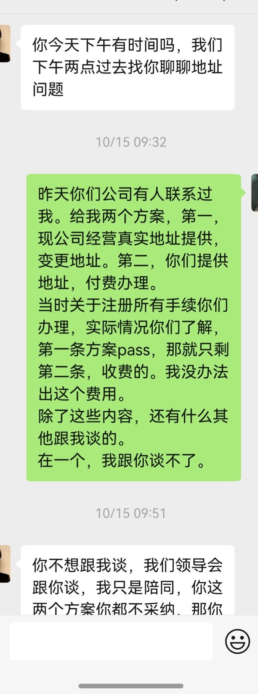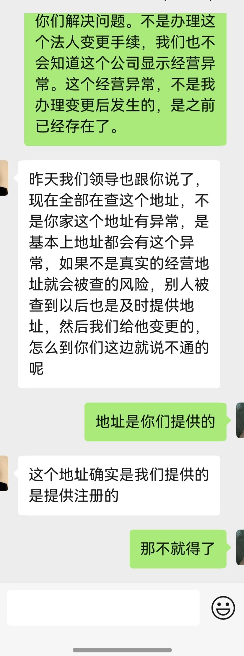 现在自己去变更法人,工商局查出经营地址异常,办理手续你们全权办理,签合同之前怎么没说这些问题,付钱的时候也没说这些问题。现在出现问题要求我花钱去解决变更地址。不作为!