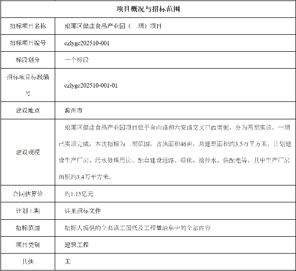 建设规模:琅琊区健康食品产业园项目位于金山路和六安路交叉口西南侧,分为两期实施,一期已实施完成,本次招标为二期范围,占地面积46亩,总建筑面积约3.5万平方米,计划建设生产厂房、污水处理用房、配套建设道路、绿化、给排水、供配电等,其中生产厂房面积约3.4万平方米。