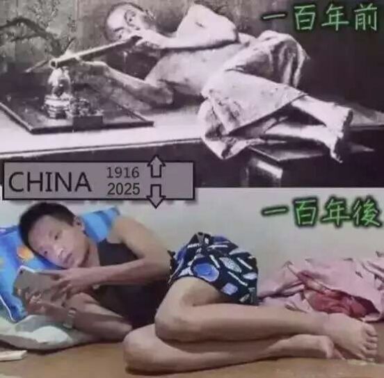 1916年的烟枪,2025年的手机,跨越百年的“躺平式沉迷”,像一场荒诞的轮回。