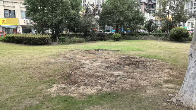 城南某小区东门门口,因电网施工,原本美丽的草地,被破坏,难道施工完,就不能还原了吗?