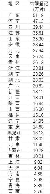 广东之后,中部地区的人口大省河南去年结婚登记人数为47.13万对,位居第二。四川、江苏、山东这三个人口大省去年结婚登记人数均超过35万对,位居三~五位。安徽、河北、云南、贵州、浙江、湖南、湖北、广西去年结婚登记人数处于20万对到30万对之间。