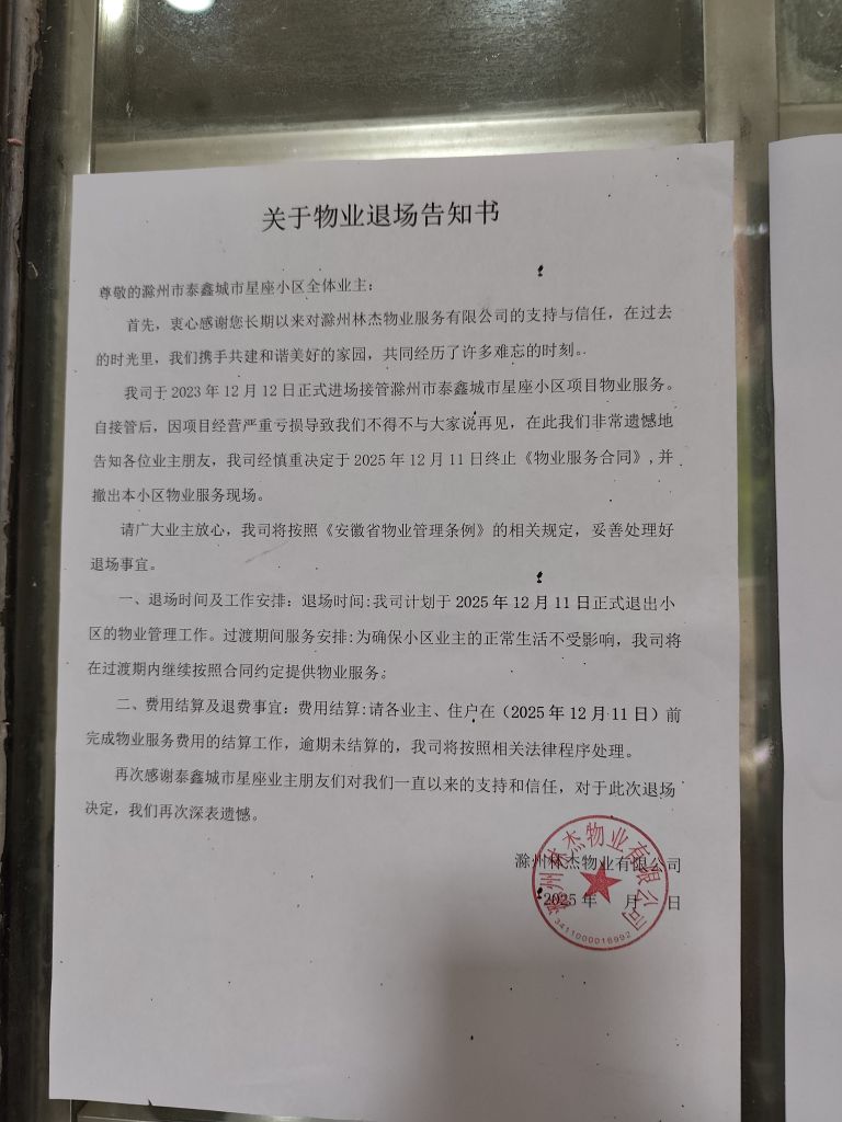 [滁州城事] 滁州泰鑫城市星座物业发布退场通告,黯然退场 |