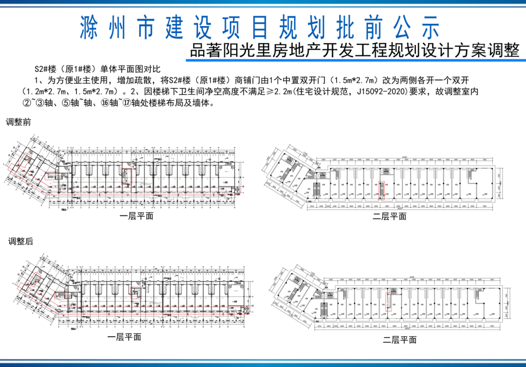 该项目位于滁州市南谯区全椒路与祈福寺路交叉口东北侧。建设单位为滁州市中丞房地产开发有限公司。用地性质为二类居住商业用地,总用地面积约72290平方米,主要调整内容:将S2#楼(原1#楼)商铺门由1个中置双开门(1.5m*2.7m)改为两侧各开一个双开门(1.2m*2.7m、1.5m*2.7m),调整室内②~③轴、⑤轴~轴、轴~轴处楼梯布局及墙体。2025年10月29日—2025年11月6日(共7个工作日)