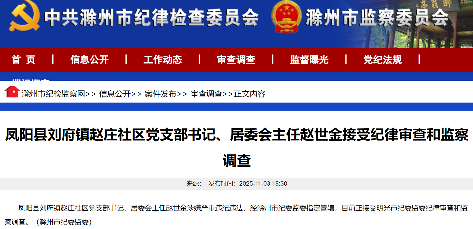 凤阳县刘府镇赵庄社区党支部书记、居委会主任赵世金涉嫌严重违纪违法,经滁州市纪委监委指定管辖,目前正接受明光市纪委监委纪律审查和监察调查。(滁州市纪委监委)