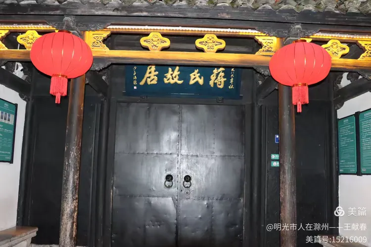 终于走到“蒋氏故居”门前,蓝底金书的牌匾在雨夜里格外醒目。两盏红灯笼垂着流苏,随风轻摆。木雕门框精致古朴,每一刀刻痕都像是在讲述一段家族往事。我站在门前,没有进去,只是静静看了片刻——有些故事,适合远观,也适合在雨夜中轻轻想象。