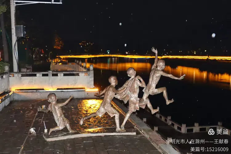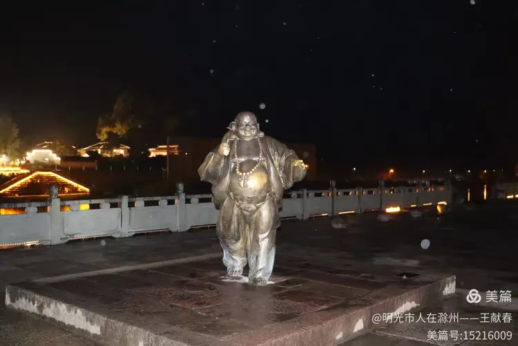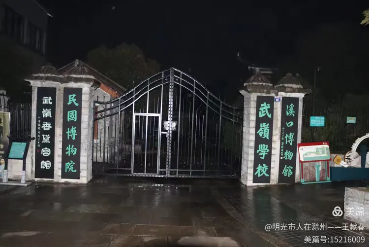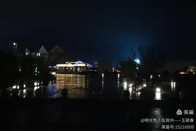 广场一侧,一个发光的圆形标志在雨中静静亮着,下方文字模糊不清,却透着某种现代与传统的交融。拱门在另一侧,内里幽深,隐约有装饰的光影。我站在中间,一边是未来,一边是过去,而我,正走在溪口的今夜。