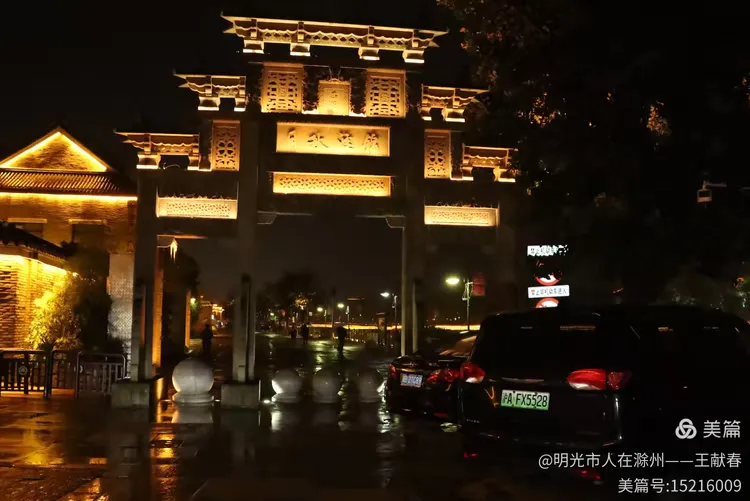 又一座中式牌坊在夜色中巍然矗立,灯光勾勒出它复杂的结构,温暖而庄严。左侧的传统建筑轮廓清晰,前方停着几辆车,街道空旷,只有雨声和灯光作伴。这壮丽与宁静的并置,让人心生敬意。