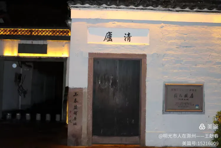 一处白墙黑框的建筑静静立着,门楣上挂着“清庐”的牌匾,灯光从屋檐下洒出,温暖而不张扬。墙边竹影婆娑,一块标牌静静说明着什么。这里不像景点,倒像某个隐居者的居所,清静、古朴,与世无争。