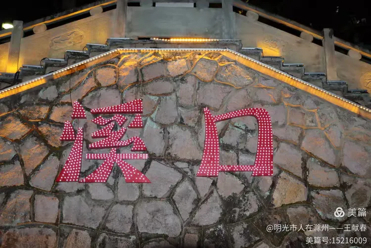 沿着石墙缓步前行,一面由粗粝石块垒成的古墙在灯光下泛着温润的光泽。墙头嵌着木质栏杆,檐角微翘,而墙上那两个鲜红的“溪口”大字,被灯光一照,红得沉静又庄重。白色圆点点缀在笔画之间,像是雨夜里悄然绽放的小花,为这方土地添了几分灵动。