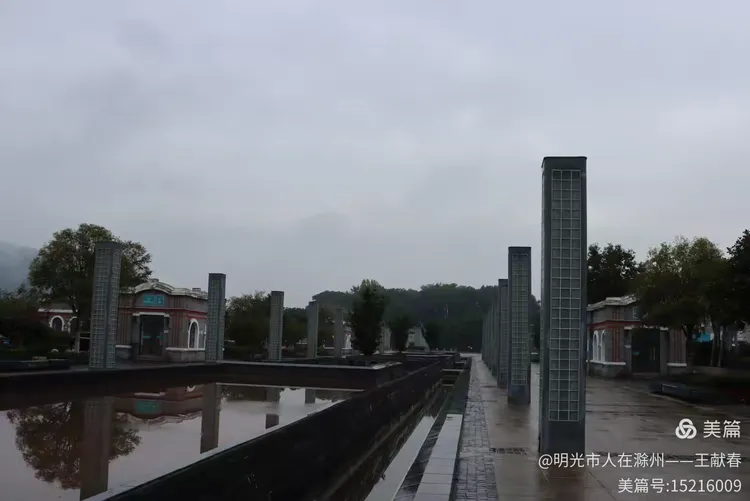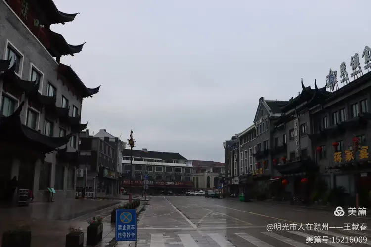 沿着宾馆前的小径往老街深处走,一条古色古香的街道渐渐浮现眼前。两侧是飞檐翘角的中式建筑,灰墙整齐,窗棂对称,像是从旧时光里走出来的模样。雨水在屋檐上凝成细珠,一串串滴落,敲在青石板上,发出轻柔的“嗒嗒”声。街道空无一人,唯有我独自穿行其间,仿佛误入了一幅水墨长卷。远处隐约可见几幢现代建筑的轮廓,在阴沉的天色下与老屋相望,传统与现代在此刻悄然交汇,却并不突兀,反倒有种奇妙的和谐。