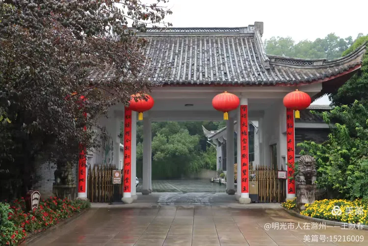走到一处宅院门前,三盏红灯笼静静悬挂在门楣上,被雨水打湿的红显得更加深沉,像是沉淀了岁月的颜色。门两侧贴着褪色的对联,字迹虽已模糊,却仍透出几分年节的余温。灰瓦屋檐高高翘起,像鸟翼欲飞,门前几级石阶被雨水洗得发亮,两旁绿植点缀其间,显得清幽而雅致。我驻足片刻,仿佛听见了昨夜雨声里,这扇门后曾有低语与茶香。