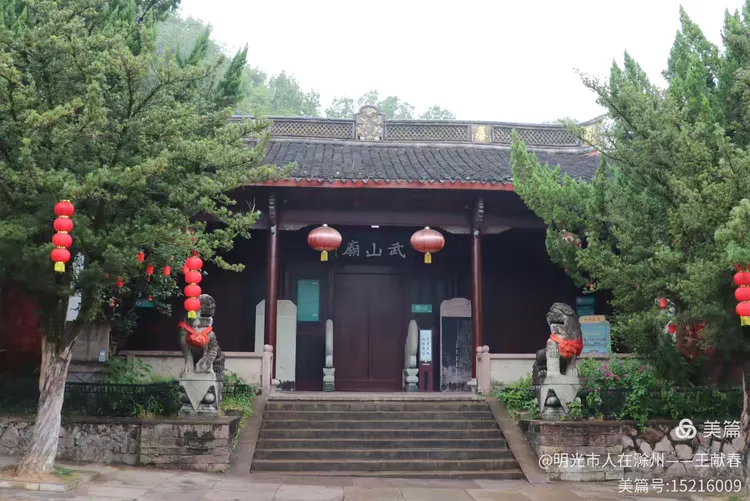再往前不远,一座庙宇静静伫立,门上“武山庙”三字清晰可见。门前一对石狮子蹲坐两侧,虽经风雨,神情依旧威严。红灯笼在微风中轻轻晃动,映着湿漉漉的石阶,透出几分庄重与安宁。庙宇周围绿树成荫,枝叶在雨中愈发青翠,仿佛连空气都带着一丝肃穆的清香。我未推门而入,只是站在檐下避了片刻雨,听风过林梢,心也跟着静了下来。
