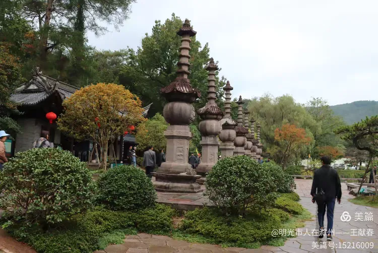 再往深处走,秋意渐浓。几株金黄的树影映在青石小路上,一排石塔静静矗立,塔身斑驳,却仍能看出昔日的庄严。几位游客缓步而行,脚步轻得怕惊扰了这份宁静。我站在石塔前,忽然明白,这里不只是风景的陈列,更是历史的沉淀场——张学良曾在此幽禁,那些无法言说的岁月,就藏在这片山林的呼吸之间。